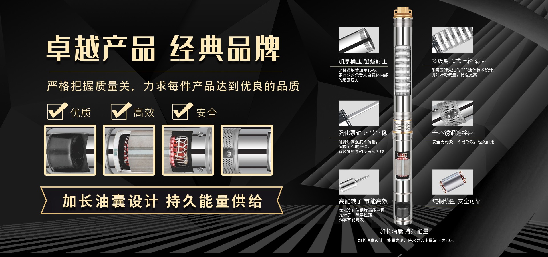 不僅僅是泵,更是流動的科技。十多年來,本公司堅持走:以質量求生存以科技創新求發展,重合同守信用的道路,生產經營得到迅速發展。更希望以后不管從發達城市到新農村,從工業制造到尖端科技產業都隨處可見創江井泵的身影,創江深井泵已成為干萬用戶心目中優質和信心的保證我們將以優質的產品和最完善的售后服務來真誠與各界朋友開展廣泛的合作,共同創造一個美好的未來!